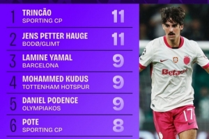 体育资讯10月23日讯 本赛季欧冠联赛阶段已战罢3轮,Squawka统计了到目前为止完成过人榜单,葡体前锋特林康和博德闪耀攻击手海于格都是11次,分列前二。