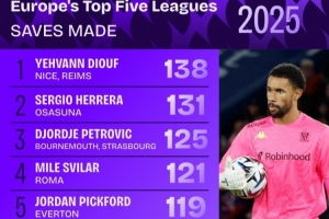 2025年五大联赛扑救榜:尼斯门将叶赫万·迪乌夫138次居首