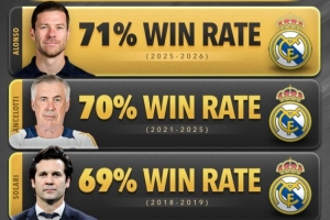 皇马近五任主帅胜率:阿隆索71%居首,安帅70%第2,齐达内61%第5
