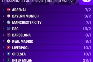 欧冠最新夺冠赔率:阿森纳居首,拜仁、曼城、巴黎、巴萨前五