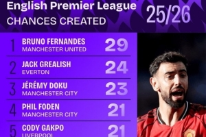 本赛季英超创造机会榜:B费力压格拉利什居首,曼城、利物浦各2人